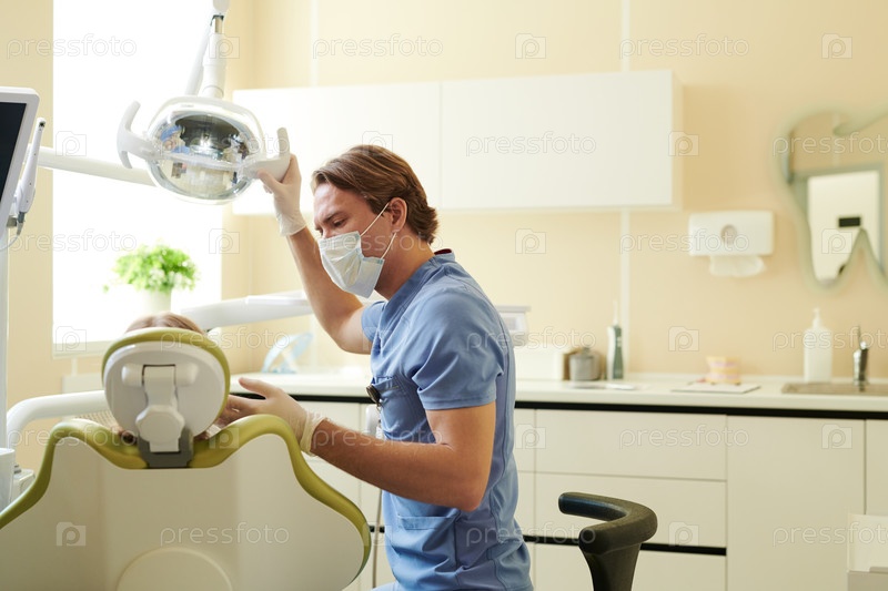 Молодой взрослый мужчина-стоматолог осматривает пациента в современной стоматологической клинике