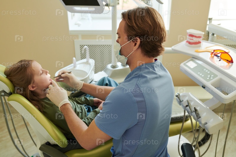 Молодой взрослый мужской стоматолог, осматривающий зубы пациентки-ребенка