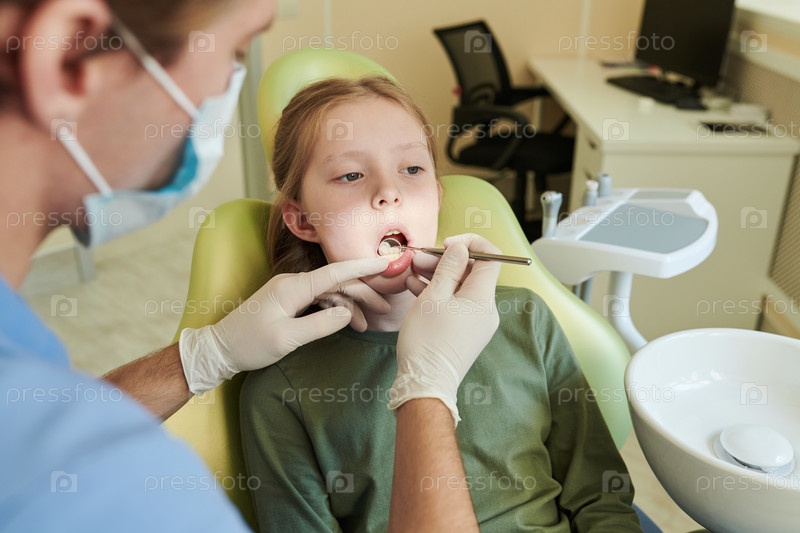 Девочка-ребенок получает стоматологический осмотр у мужского зубного врача