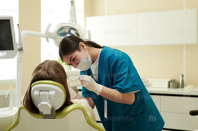 Молодой взрослый женский стоматолог, осматривающий детского пациента в клинике