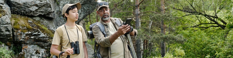 Мужчина средних лет учит мальчика-подростка рыбалке на открытом воздухе в лесу