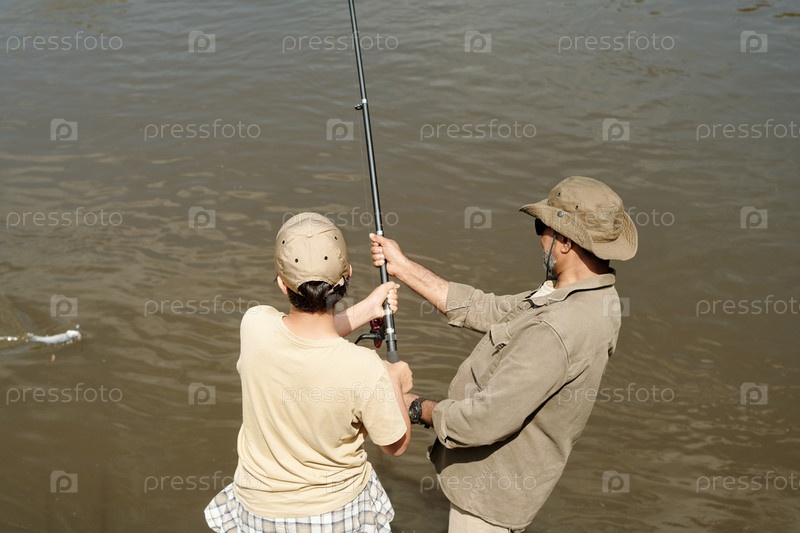 Мужчина средних лет и молодой мальчик вместе ловят рыбу на открытом воздухе у реки
