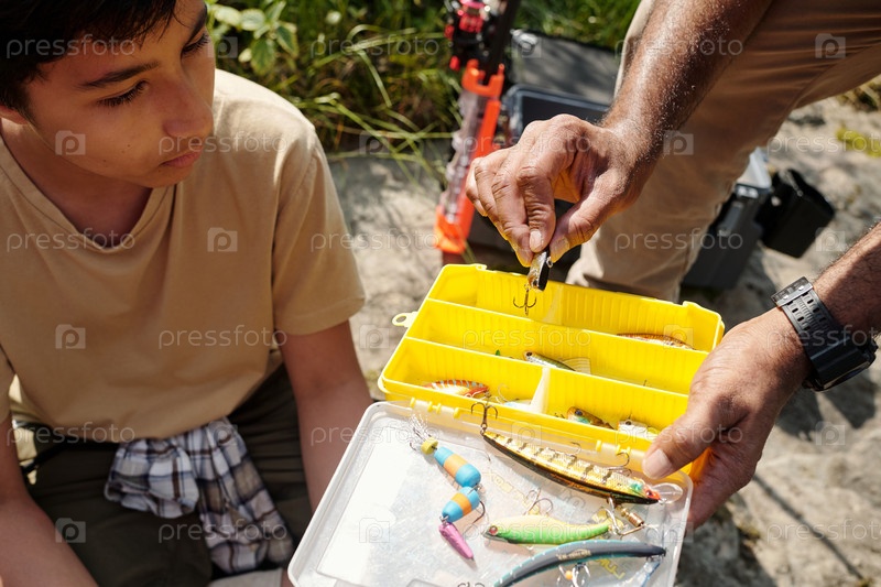 Отец учит своего мальчика рыбалке на свежем воздухе