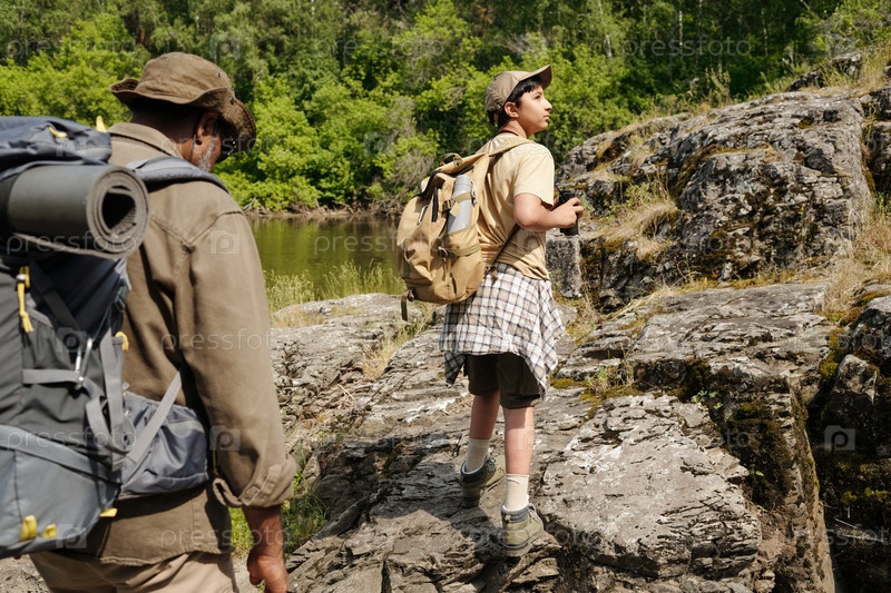 Мужчина средних лет и молодой мальчик ходят в походы возле реки, готовясь к рыбалке
