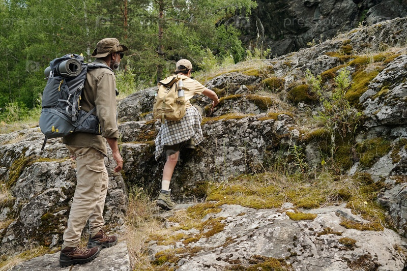Мужчина средних лет и мальчик вместе ходят в поход по тропе Скалистых лесов