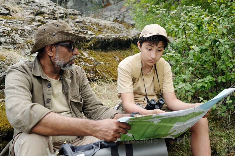 Южноазиатский мужчина средних лет и мальчик-подросток изучают карту во время рыбалки на открытом воздухе