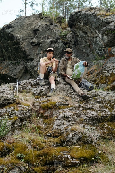 Мальчик и чернокожий мужчина среднего возраста вместе ловят рыбу на скалистой открытой скале