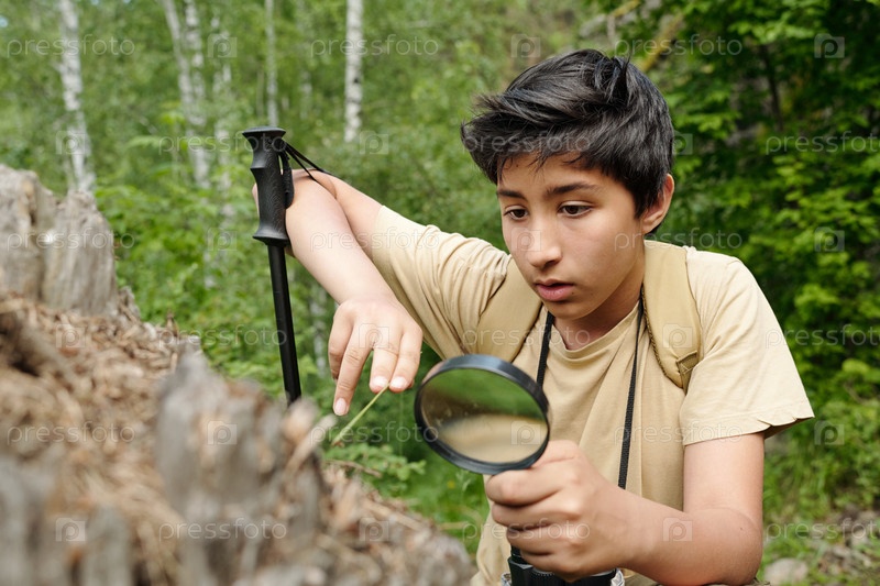 Мальчик-подросток исследует природу с помощью увеличительного стекла во время открытого приключения