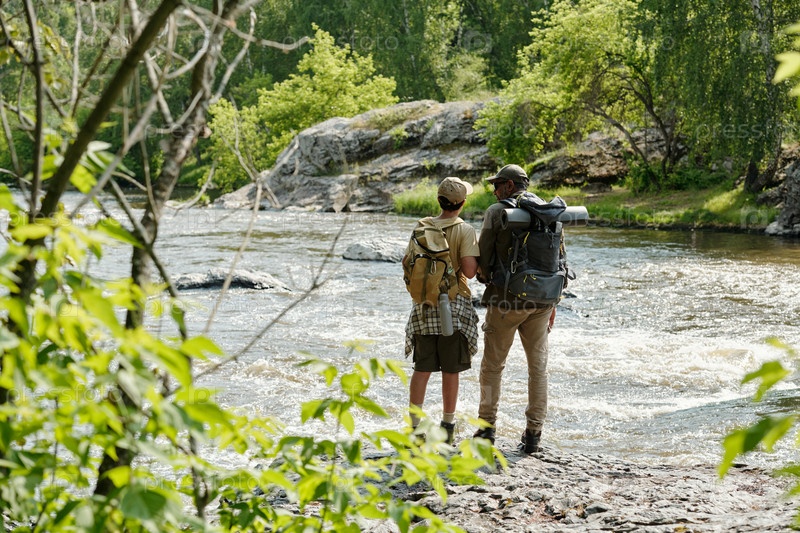 Отец и молодой сын вместе ловят рыбу у реки в летнем лесу