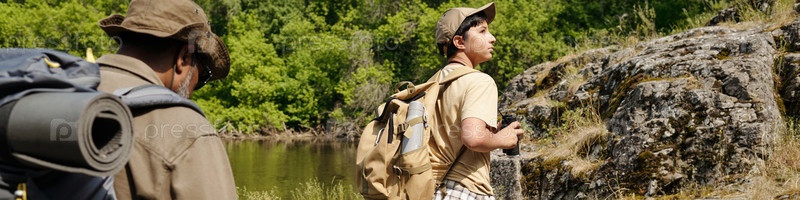 Отец и сын-подросток вместе ловят рыбу у реки в условиях природы