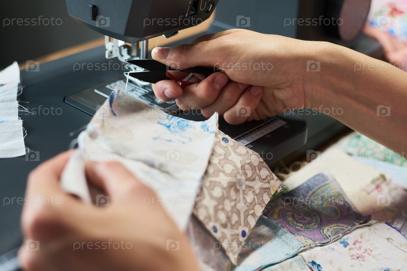 Молодая взрослая женщина шит тканевые изделия с использованием швейной машины в помещении
