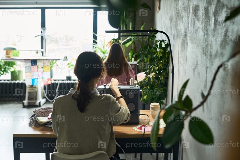 Молодая взрослая женщина шьет машиной в Bright Creative Studio