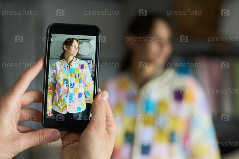 Молодая взрослая женщина позирует на фото со смартфонами в помещении