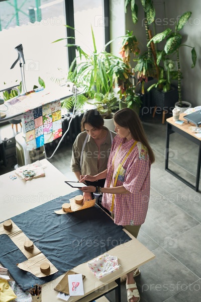Две молодые взрослые женщины сотрудничают, разрабатывая модные узоры