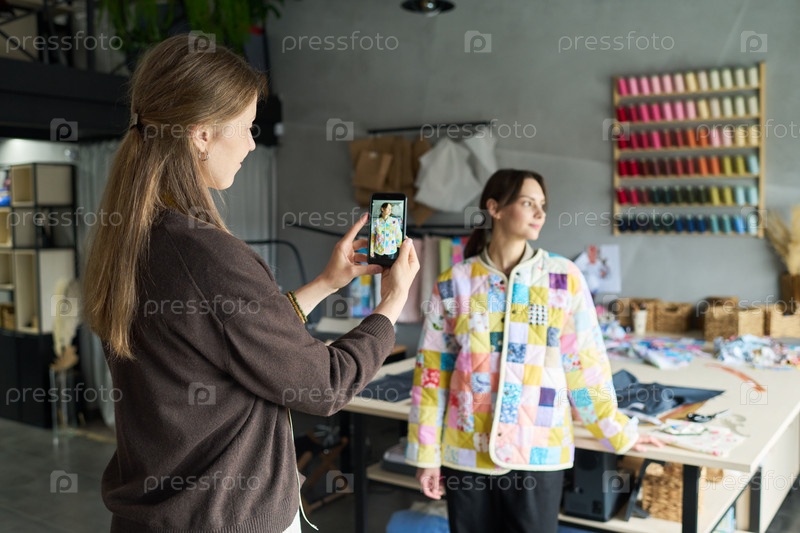 Молодая женщина фотографирует молодую женщину, позирующую на семинаре