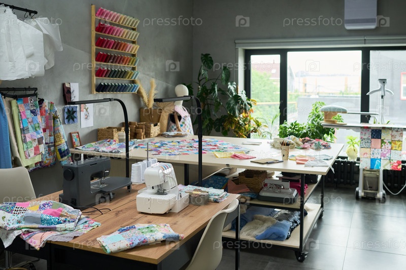 Швейные машины и красочные ткани из ковриков устроены в креативной студии