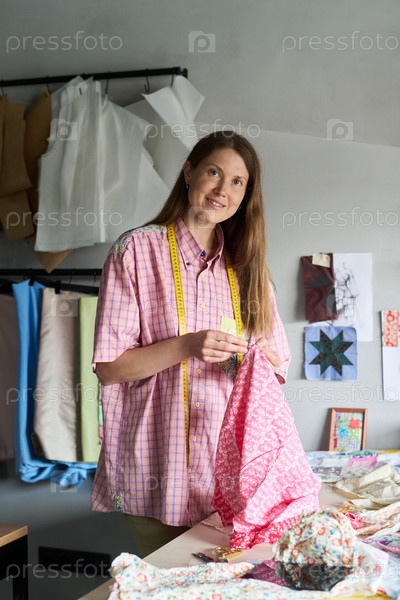 Портрет женщины, шиющей ткань в креативной студии