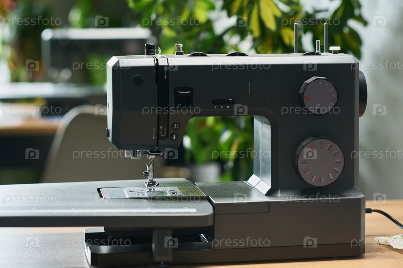 Швейная машина стоит на столе в светлой комнате с современными зелеными растениями