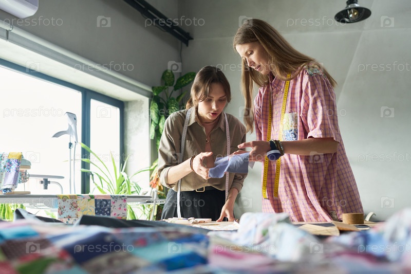 Молодые взрослые женщины изучают образцы ткани, планируя дизайн одеяла