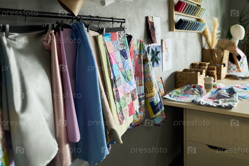 Красочное пластырное одеяло и ткань, висящие в креативной швейной мастерской