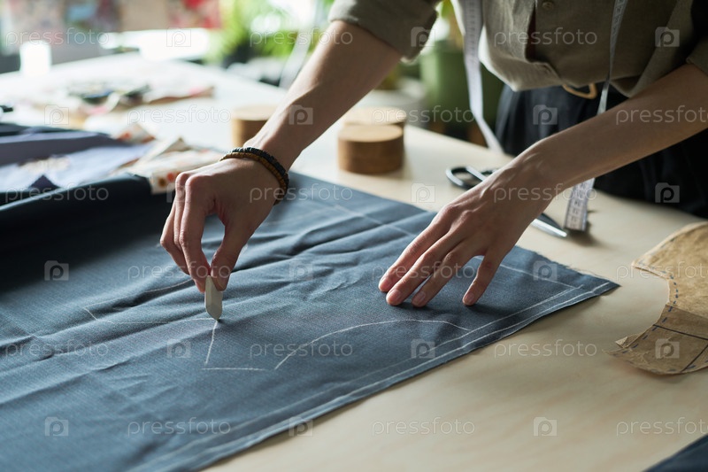 Молодая взрослая женщина рисует узоры на ткани, разрабатывая одежду