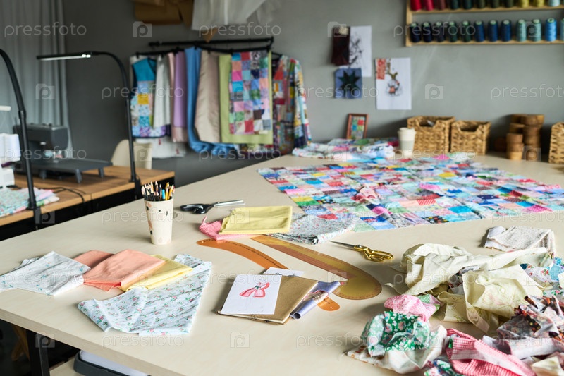 Текстильный студийный стол, демонстрирующий пластырь Patchwork Quilt and Sewing Supplies