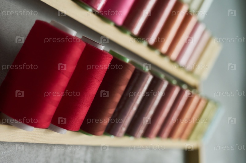 Шпули красочных швейных нитей расположены на деревянной полке в мастерской