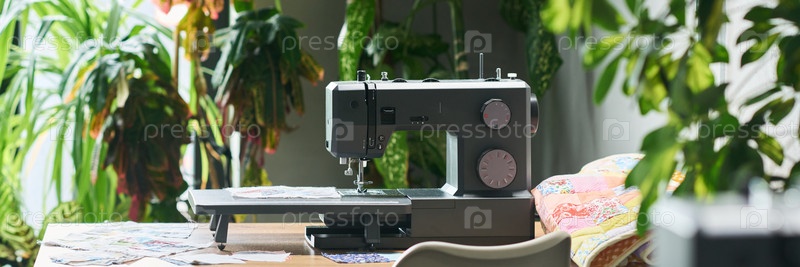 Швейная машина работает на столе в окружении зеленых комнатных растений