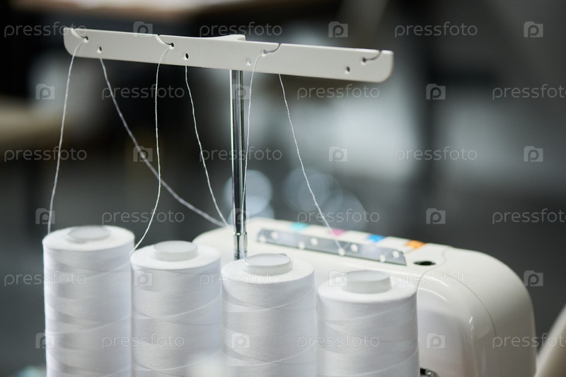 Ближайшее изображение промышленных швейных машин с катушками нитей, расположенными в текстильной мастерской