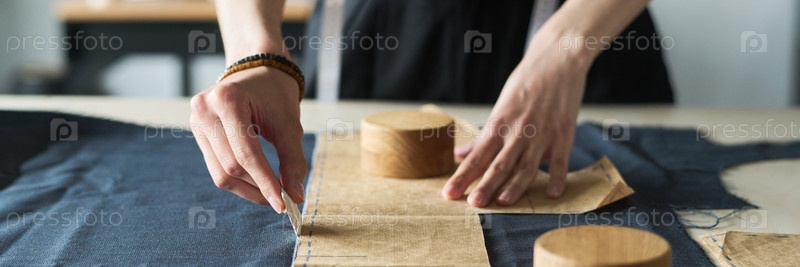 Молодая взрослая женщина режет образцы ткани, разрабатывая одежду