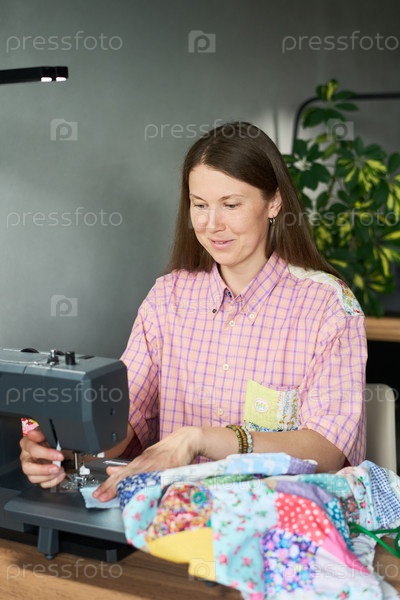 Женщина шит красочное одеяло с помощью швейной машины