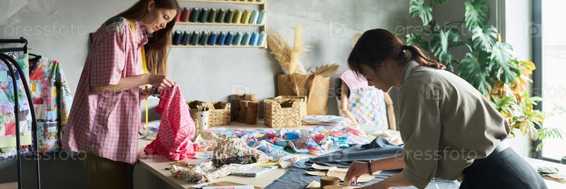 Две молодые взрослые женщины, создающие текстильные ремесла ручной работы в мастерской