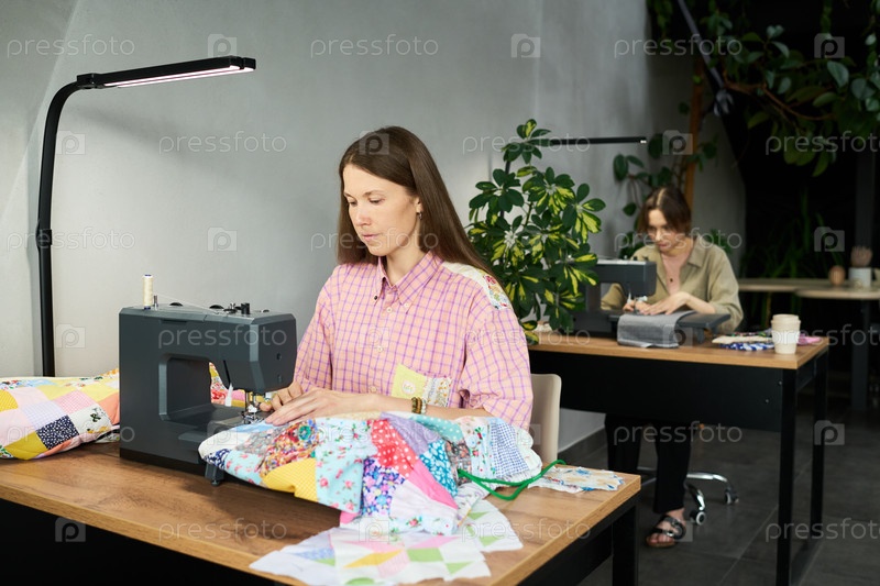 Молодая женщина шиет пластырь на швейной машине в студии