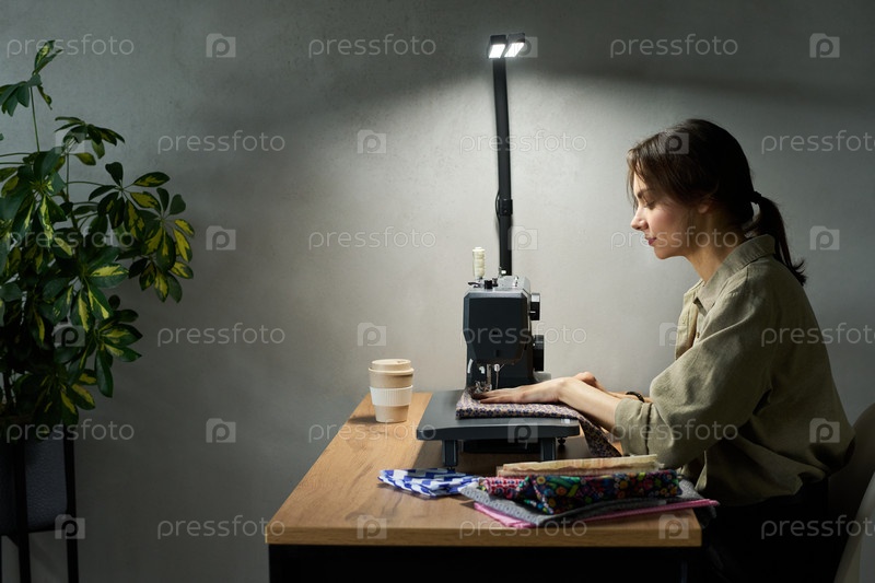 Молодая женщина шит ткань с помощью швейной машины в современном рабочем пространстве