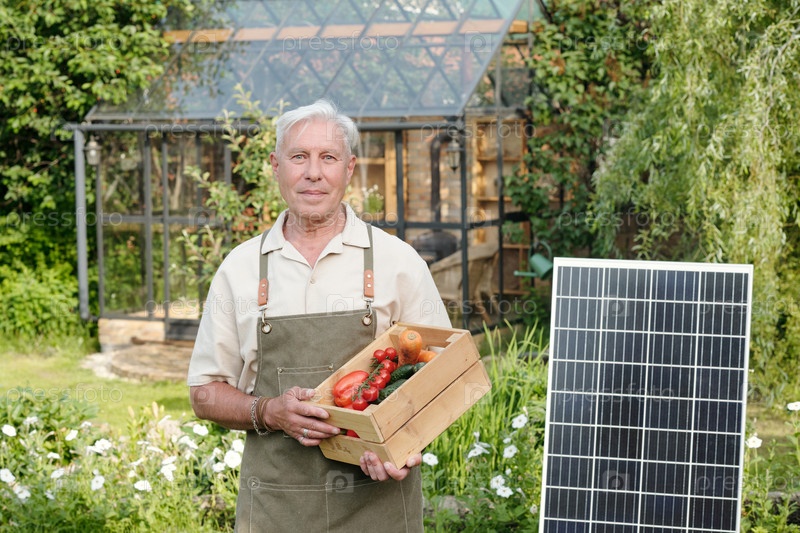 Портрет старшего человека, удерживающего овощи, стоящего возле солнечной панели