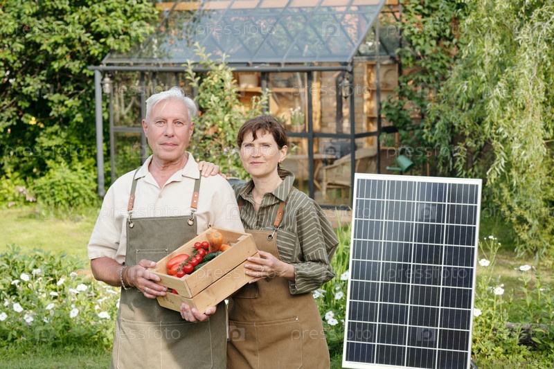 Пара средних лет, стоящая на открытом воздухе и держащая собранные овощи