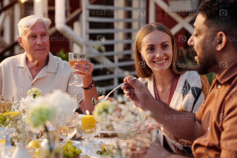 Мультиэтническая группа взрослых, наслаждающихся ужином на свежем воздухе, собираются вместе