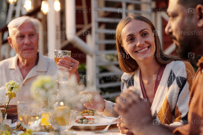Женщина, улыбающаяся во время ужина на свежем воздухе с разными друзьями