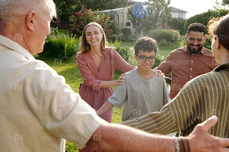Мультиэтническая семья и друзья формируют круг на открытом воздухе улыбаются и смеются