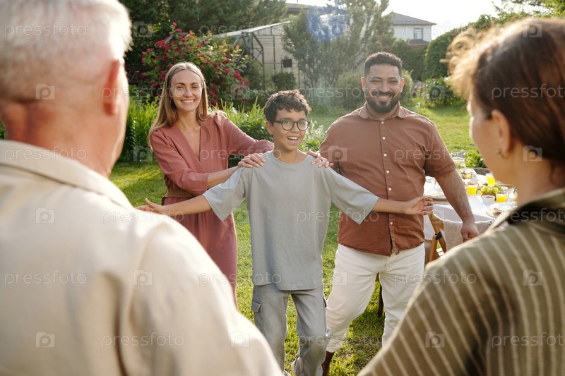 Многонациональная семья собирается на открытом воздухе, улыбаясь и обнимая друг друга