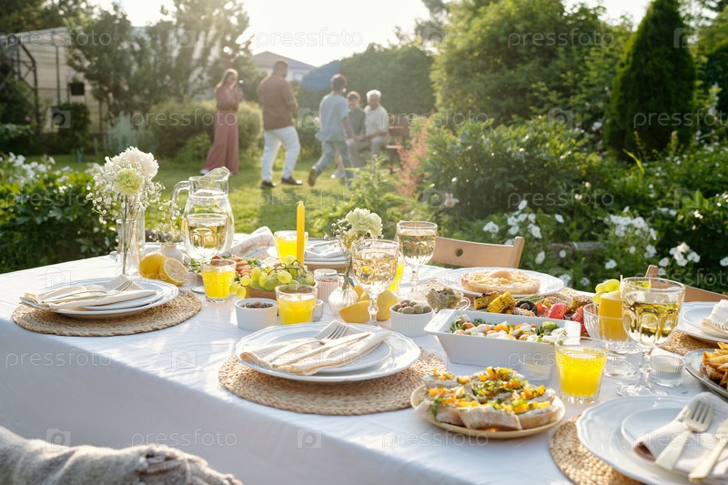 Набор столов на открытом воздухе с едой и напитками