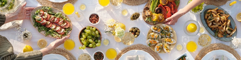 Мультиэтническая группа делится летним обедом на открытом воздухе, наслаждаясь свежей едой вместе
