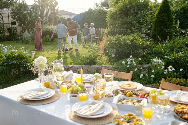 Набор праздничных столов с едой и напитками на открытом воздухе