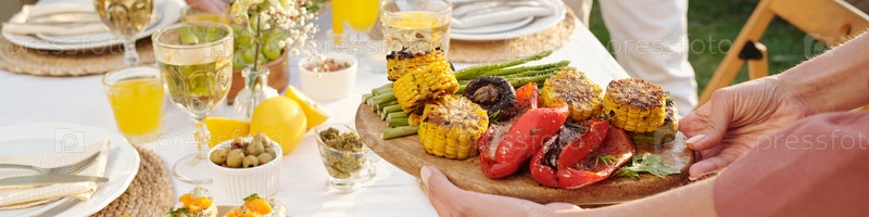 Руки, представляющие жареную кукурузу и овощи во время летнего праздника на открытом воздухе