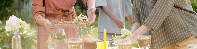 Женщина, подающая еду во время встречи на открытом воздухе с друзьями