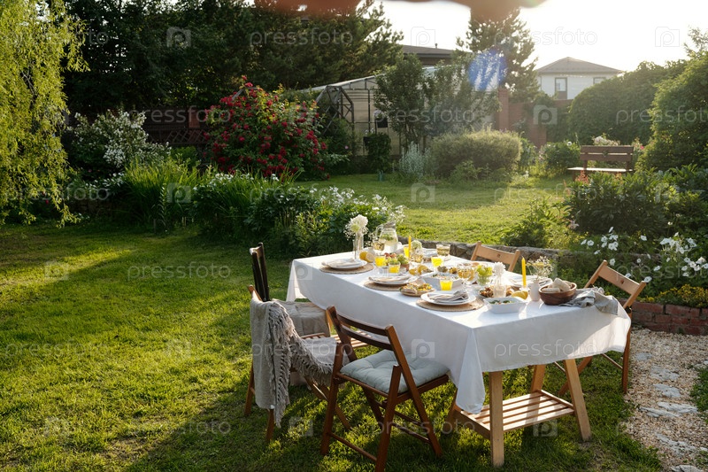 Настроение стола на открытом воздухе, ожидающее гостей во время летнего садового сбора