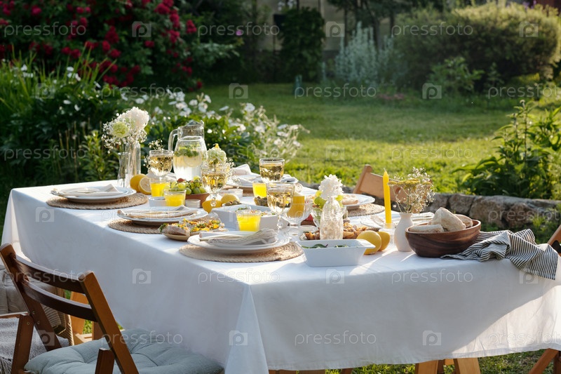 Солнечный столик на открытом воздухе, устроенный для летнего завтрака Собрание в саду