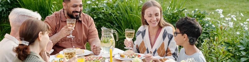 Мультиэтническая группа взрослых и детей, наслаждающихся ужином на открытом воздухе в саду вместе