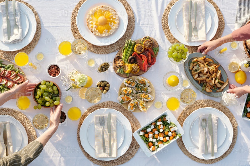Мультиэтнические молодые взрослые делятся праздничными обедами на свежем воздухе и передают еду