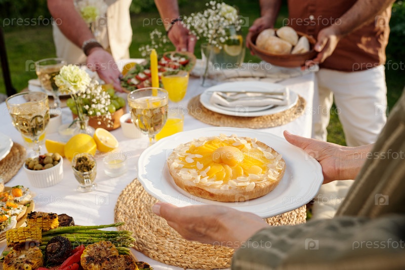 Женщина, подающая фруктовый пирог во время сбора садов на открытом воздухе